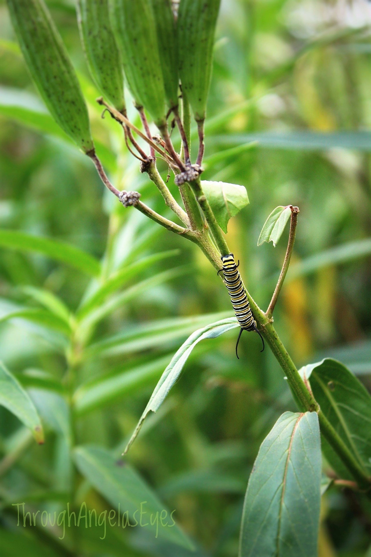 Pictured on right is one of many Monarch caterpillars feeding on a patch of swampy milkweed growing in our fields.